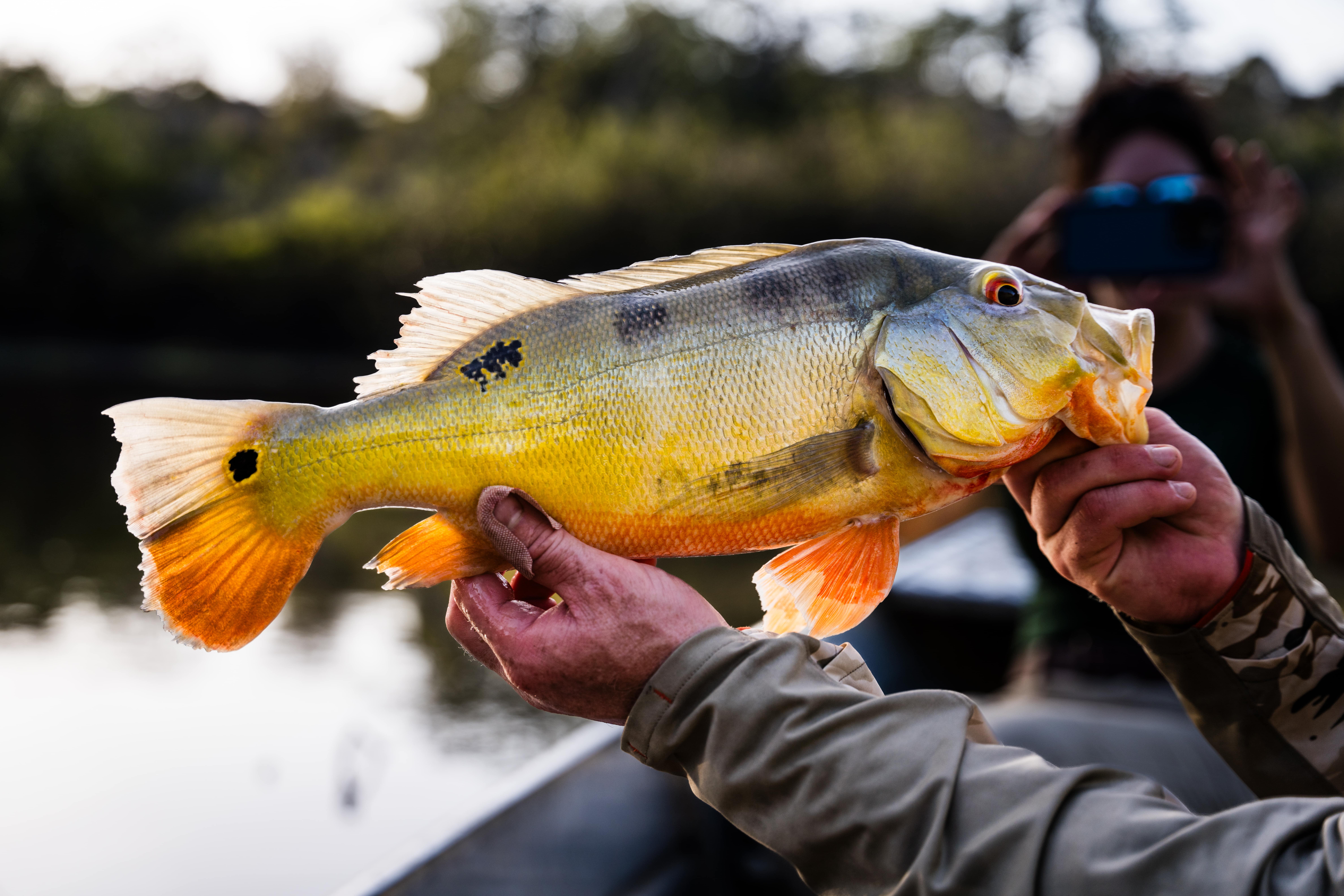 Jesse: “Well, fishing was slow, and I was the only guy filming, so not a ton. But I did catch a few peacocks, and I actually hooked the largest arapaima on the trip off-camera. I think April has some cell phone clips of it, but it was massive. It pulled us from one end to the lake and back. We got it boatside eventually, and the leader popped, unfortunately, but the guide estimated it to be around 425 lbs. It was massive. The curse of the cameraman, haha.”